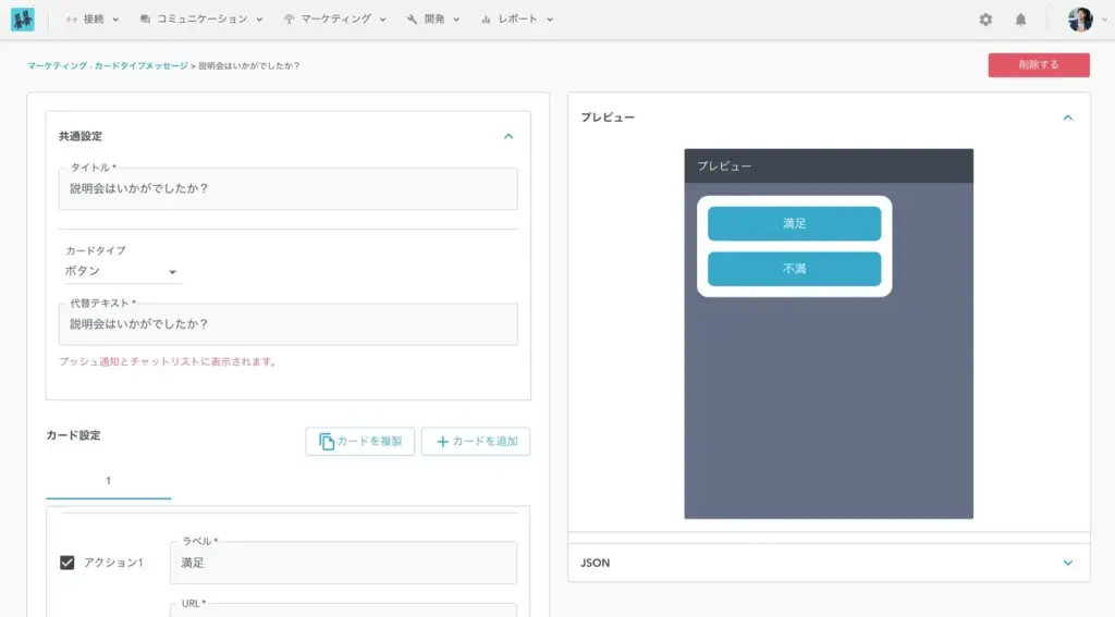 A new card type “button” has been added to Card Type Messages. You can easily create a message that prompts the user to make a choice.
