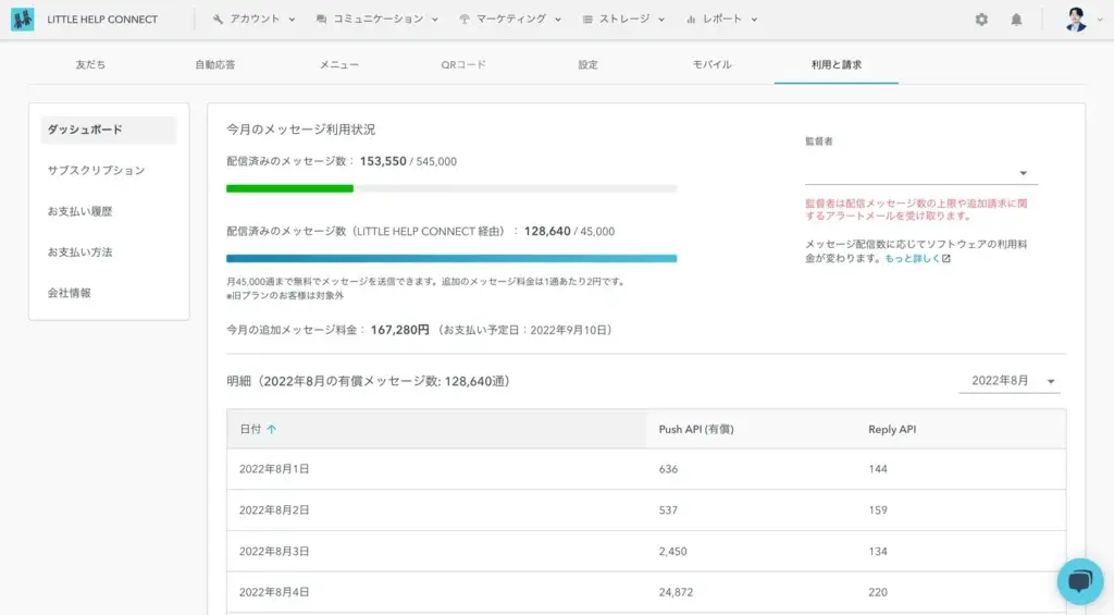 The number of successful Push API attempts is what LITTLE HELP CONNECT is billed for. Figures are based on totals provided by LINE.