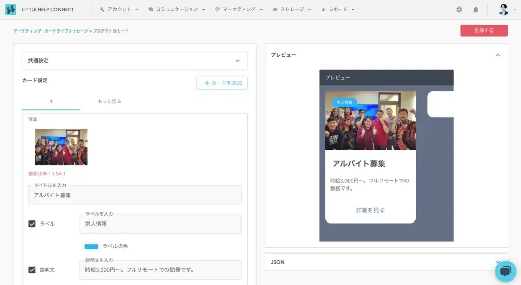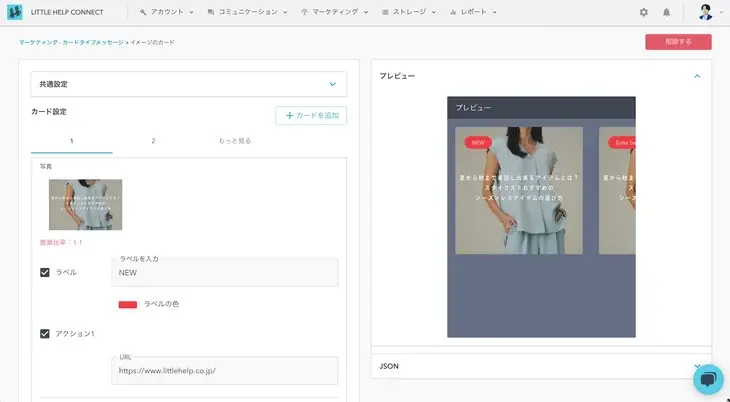 You can create a card-based message (carousel) from the menu “Marketing” “Card Type Message. Three types of card templates are available: “Products,” “Pictures,” and “JSON.