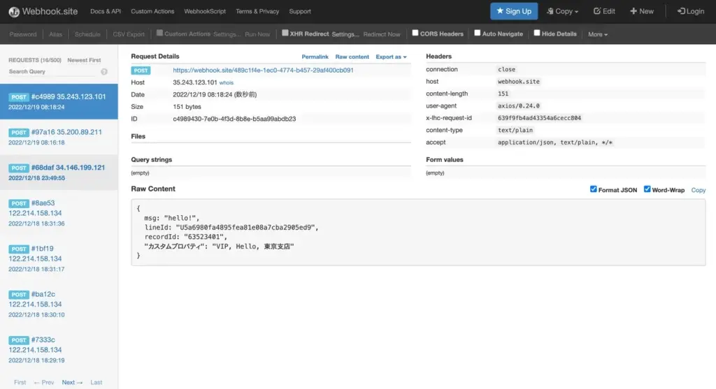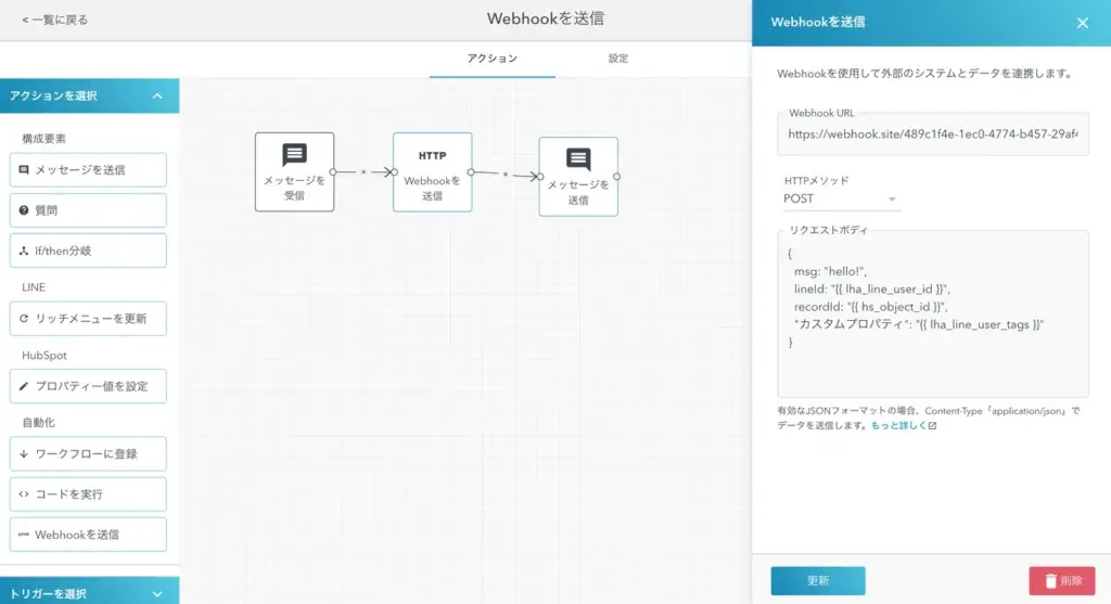 – Using the “Send a webhook” action, you can sync data between Little Help’s chatflow and external systems. (Example: When a specific message is received on LINE, the User ID and custom property values of the contact are sent to the company’s system)