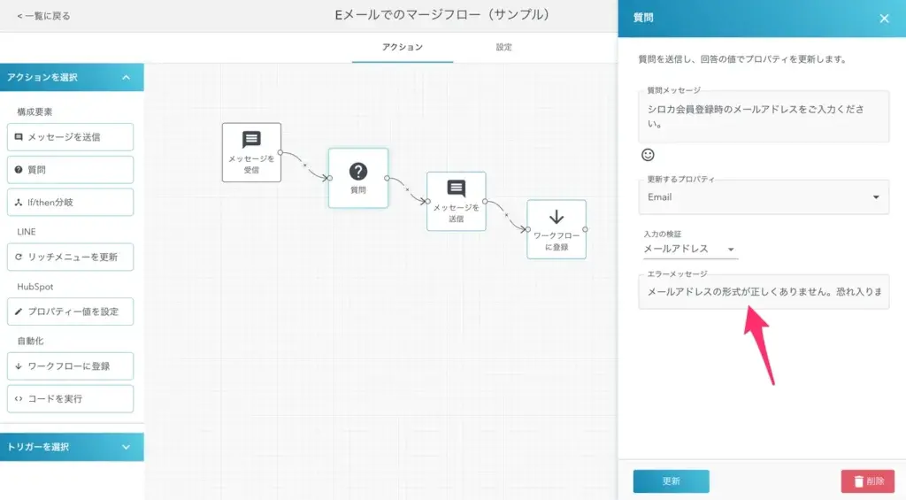 2. Specify the pattern of values you wish to check in the “Input Validation” section of the question action. We have prepared patterns for “e-mail address,” “phone number (without hyphen),” and “katakana,” but you can also create your input checks using regular expressions.