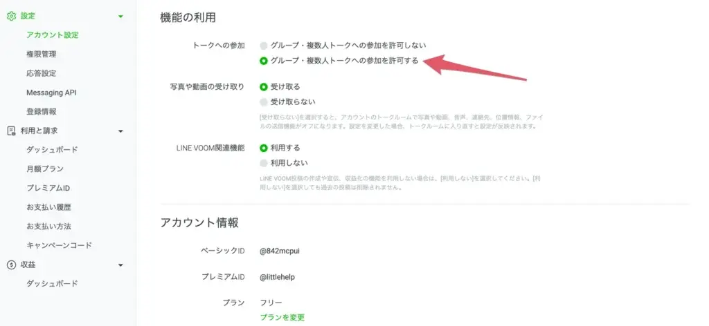 You must also set “Group and multi-person chats” to “Allow account to join groups and multi-person chats” in the account settings of your official LINE account.