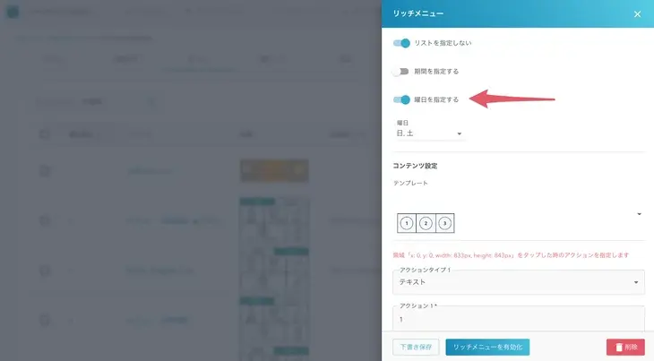 Why does it matter? The ability to specify the day of the week allows for more flexible operation of rich menus. How does it work? Enable “Specify days of the week” in the rich menu settings and specify the days of the week to be applied. Multiple days of the week, from Monday to Sunday, can be set.