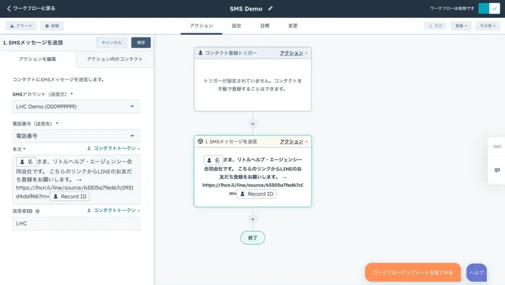 HubSpotワークフローからアクリートのSMSメッセージを配信できます。