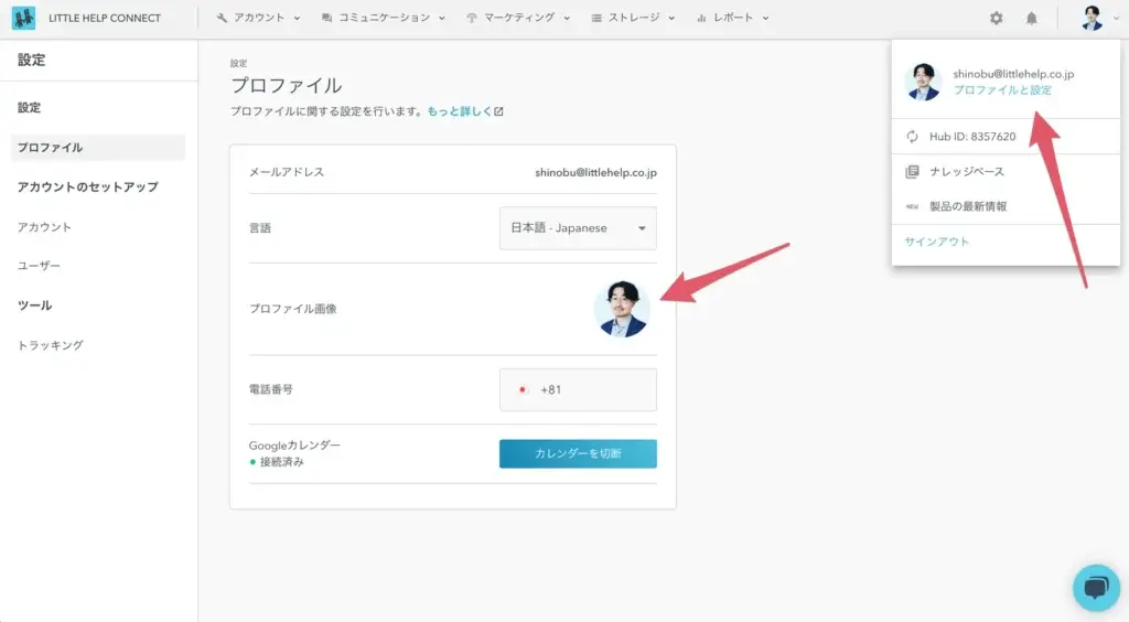 The user name and profile image are set on the LITTLE HELP CONNECT administration console. You can create a user from “Users” in the settings. The name you set here will be the “sender name” (We map users using their email address as a key when sending from HubSpot).